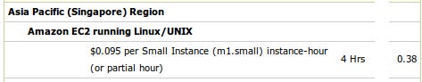 If Amazon considered all of this activity to be taking place by a single instance in a single hour real time hour then the charge would have been $0.095 (m1.small in the ap-east-1 region). However, Amazon considers each of these run sessions to be starting a new hour of charges, so I was charged for 4 hours of instance time at $0.38.
