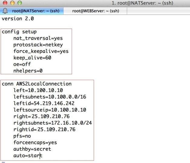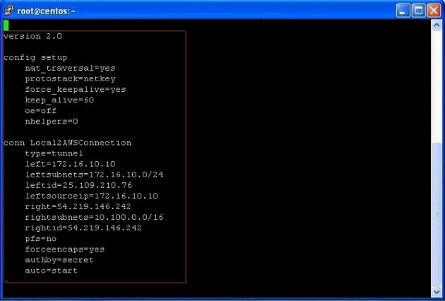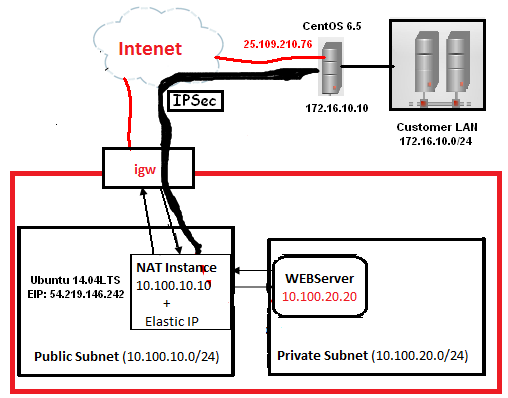 In this tutorial, we will use the previous scenario on AWS side for the creation of site-to-site vpn between AWS VPC and Local site. On Amazon side, we’ll use Ubuntu 14.04 LTS, which will act as gateway for private subnet(s) plus the vpn gateway, while on the Local site, we’ll use the CentOS 6.5, which will perform the same tasks as of Ubuntu on AWS side (gateway for LAN plus vpn gateway).